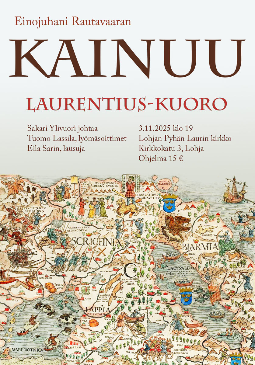 Maanantaina 3.11. klo 19 alkaa Lohjan Pyhän Laurin kirkossa Laurentius-kuoron konsertti KAINUU, jota johtaa musiikin tohtori Sakari Ylivuori.